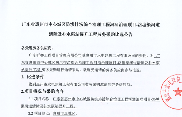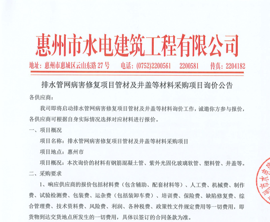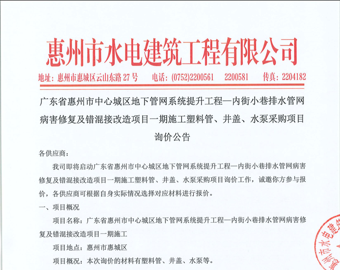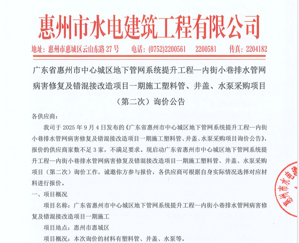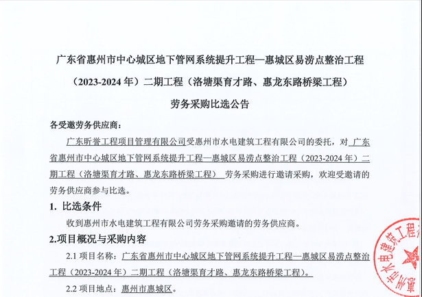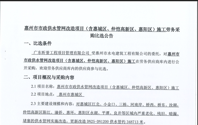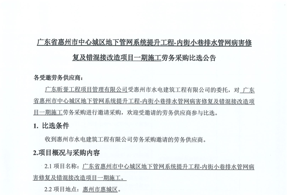 廣東省惠州市中心城區(qū)地下管網(wǎng)系統(tǒng)提升工程-內街小巷排水管網(wǎng)病害修復及錯混接改造項目一期施工勞務采購比選公告……