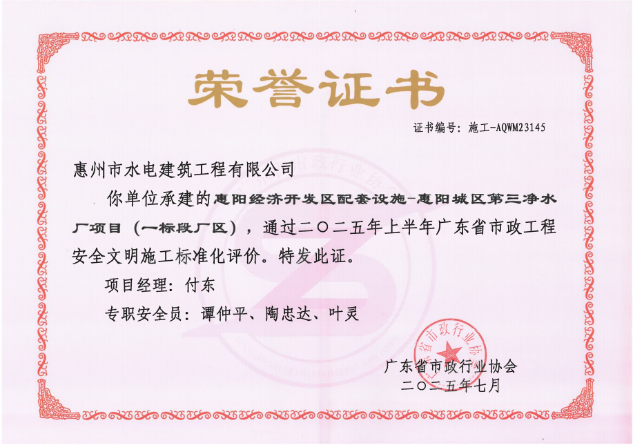 近日,廣東省市政行業(yè)協(xié)會傳來喜訊,由我司承建的惠陽經(jīng)濟開發(fā)區(qū)配套設施—惠陽城區(qū)第三凈水廠項目(一標段廠區(qū)),順利通過2025年上半年“廣東省市政工程安全文明施工標準化”評價?!?/p>